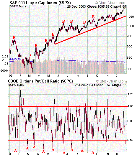 when the Put to Call Ratio has dropped below .60 (point A) that some selling